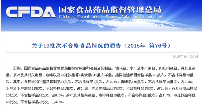 2015年10月20日,中国国家食品药品监督管理总局网站上发布了近期该局对食用油和油脂及其制品、调味品等7类食品841批次样品的抽检结果,其中,重庆黄花园酿造调味品有限责任公司、上海鑫程食品有限公司、天津市美登高食品有限公司等企业生产的19批次产品被检出不合格。