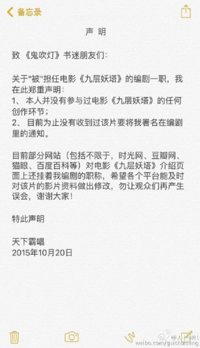 其实,今年10月20日,天下霸唱就曾在微博发布声明,强调自己从未参与过电影《九层妖塔》的任何创作环节,要求相关网站更正信息。