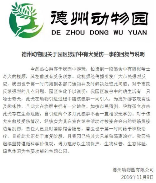 德州动物园方面一夏姓经理表示:受伤是因为狗在室内馆舍活动时被笼舍突出的钢筋焊接边角刮伤 , 目前已消除馆舍隐患,兽医也于第一时间给予积极治疗,目前此犬正处于康复阶段。夏经理称现在园方已经将狗与狼分开饲养。