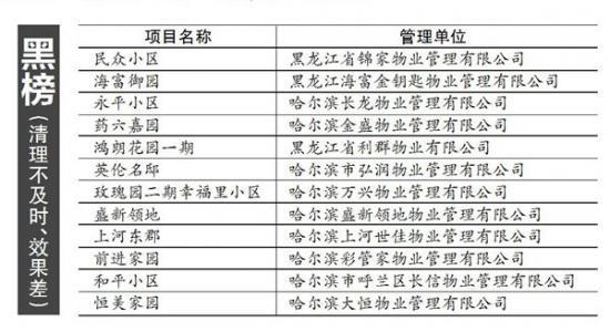 近日,哈市连降大雪,雪后小区、庭院冰雪清得怎么样?本报联合市物业办督促物企清冰雪,自17日起,物业服务考评监管人员分成7个检查组,重点对道里、道外、南岗、香坊四个主城区小区清冰雪进行了专项检查。截至21日,市区物业主管部门共对223个小区完成了检查,给予清雪较好的12家物企红榜表扬、信用加分,对清雪不及时、效果较差的12家物企予以上黑榜、信用扣分处理。
