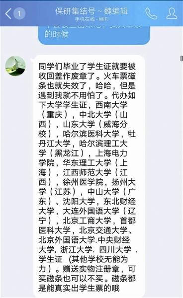 北青报记者在加其名为“保研集结号~魏编辑”的QQ号后,对方立即发来“同学们毕业了学生证就要被收回盖作废章了。火车票磁条也就失效了,哈哈,但是遇到我不怕……”的消息,同时发出的可以代办的大学学生证的学校名,其中包括首都医科大学、北京交通大学、北京外国语大学、浙江大学、四川大学等全国二十余所高校。随后还发来“260元带磁条,70元只办学生证但会送假磁条,赠送实物注册章”等字样。