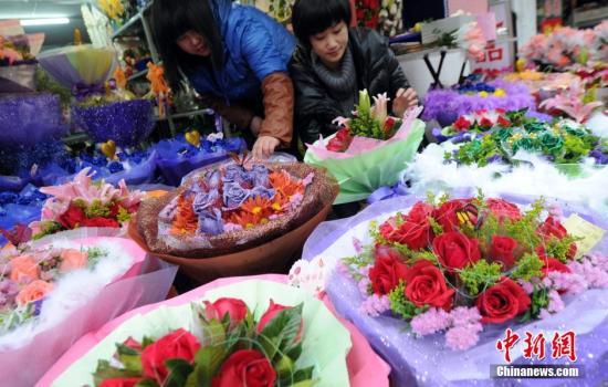 资料图:福州一花店工作人员忙着为网上火热订购情人节玫瑰花束的顾客进行装饰包装。中新社发 刘可耕 摄