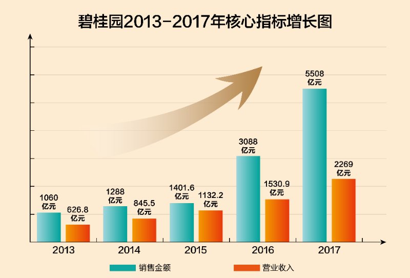 《财富》世界500强榜单以营业收入为主要指标。碧桂园集团2017年上市范围内总收入为2269亿元人民币,约为335.7亿美元,较上年跃升46%。