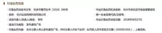 根据国家企业信用信息公示系统显示,今年6月27日,杭州达辰网络科技有限公司因发布虚假广告被被杭州市余杭区市场监督管理局处以人民币20万罚款。值得注意的是,该处罚决定书明确指出:两年内有三次以上违法行为或者其他严重情节的,处广告费用五倍以上十倍以下的罚款,广告费用无法计算或者明显偏低的,处一百万元以上二百万元以下的罚款,可以吊销营业执照,并由广告审查机关撤销广告审查批准文件、一年内不受理其广告审查申请。