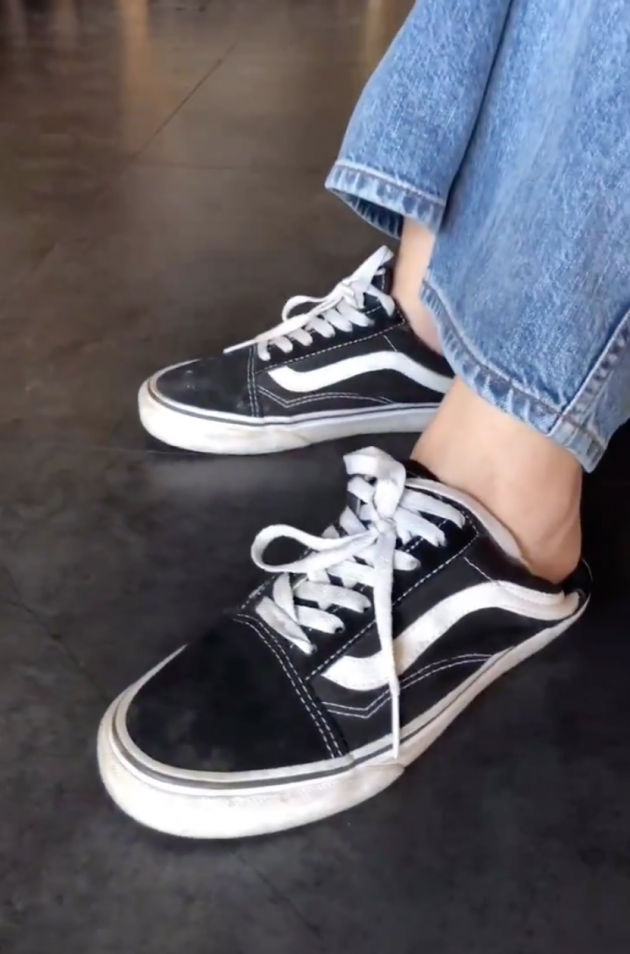 除了秀2019新款以外,还有秀自己的爱穿系列。Vans这款经典百搭old school板鞋,几乎是不分性别的人手一双呢,估计是唯一几双即使撞鞋也不觉得尴尬的球鞋之一了吧~这种踩后跟的穿法在女生中也非常流行哦~