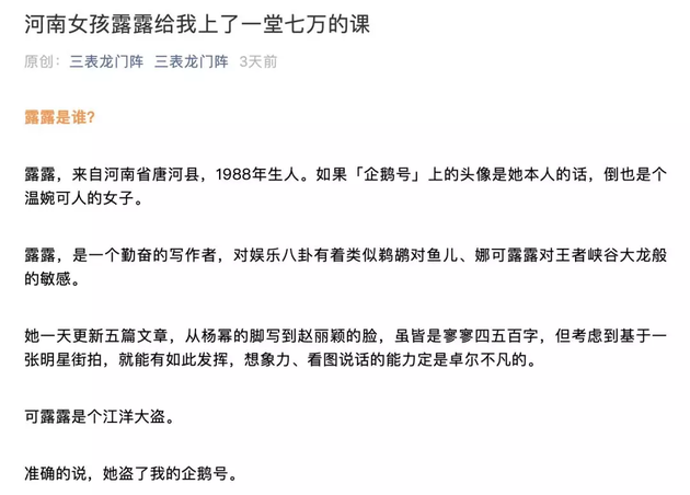 在题为《河南女孩露露给我上了一堂七万的课》的文章中,三表表示,自己在科技领域写了几年文章,但在“企鹅号”上毫无平台收益,而被盗号者“露露”改成娱乐号之后,生产的内容虽全是一小时能生产五篇的娱乐八卦标题党,但每日收益却少则上千,多则几千,在短短2个月时间内累计获得了7.5万的平台收益。