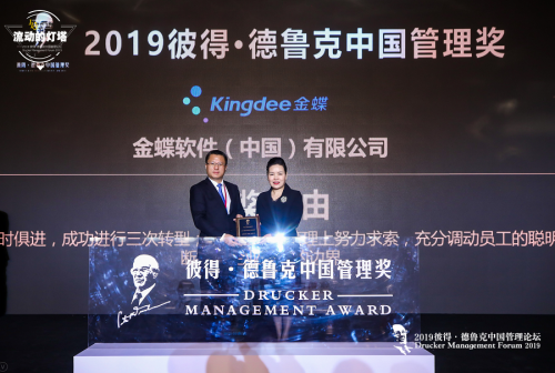 金蝶荣获2019彼得·德鲁克中国管理奖的颁奖理由是,“在26年的发展过程中,(金蝶)与时俱进,成功进行三次转型;不断在组织管理上努力求索,充分调动员工的聪明才智和工作激情,不断拓展企业成长的边界”。