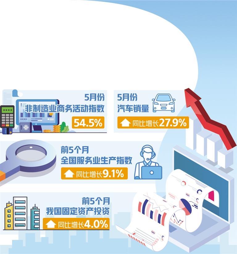 今年以来,我国服务业持续回升,非制造业商务活动指数始终运行在景气临界点以上,5月份保持在54.5%的较高水平;前5个月,全国服务业生产指数同比增长9.1%。热点消费较快增长,5月份汽车销量同比增长27.9%,餐饮、旅游等接触型聚集型服务消费明显改善,消费对经济恢复发展的拉动作用有望进一步凸显。同时,固定资产投资量增质优,前5个月,我国固定资产投资同比增长4.0%,其中制造业、基础设施投资分别增长6.0%、7.5%,高技术产业投资增长12.8%。
