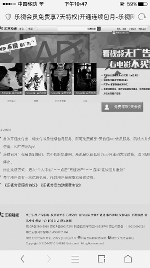 记者上乐视网看到,活动页面为免费开通会员页面,上面标注着要开通连续包月服务才能领取7天免费会员。页面下方有一行很浅的字体提示如何取消连续包月及停止续费的方式。点击进入页面后,会有绑定支付宝账户的页面,并生成需要交纳1分钱的订单。记者注意到,除活动页面的浅色字提醒之外,其他页面均无提示如何取消。乐视网的客服人员告诉记者,在参加此项活动的页面上说明十分清楚,“如果不关闭这个选项就会被扣费”。