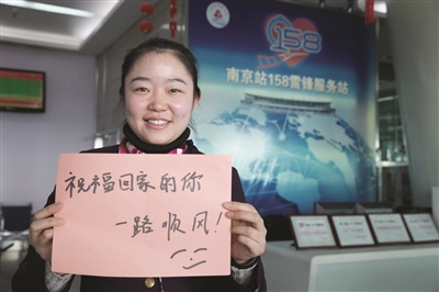 南京站158服务岗的姑娘昨天祝福春运出行的旅客。新华报业视觉中心记者 邵丹 摄