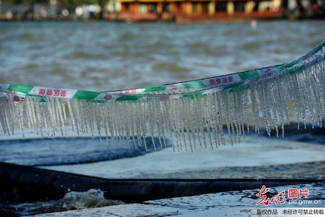 2016年1月24日,浙江省杭州市,杭州西湖边的警戒带上的冰挂。
