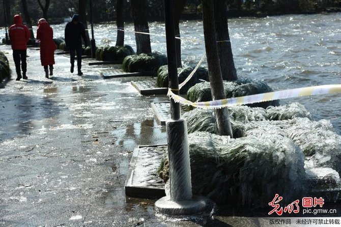 2016年1月24日,浙江省杭州市,游客在杭州西湖的长桥公园里观看成湖边的结冰情况。