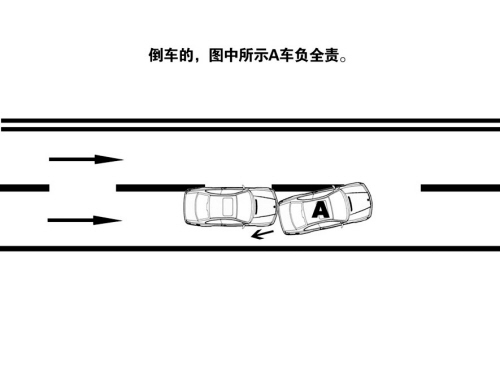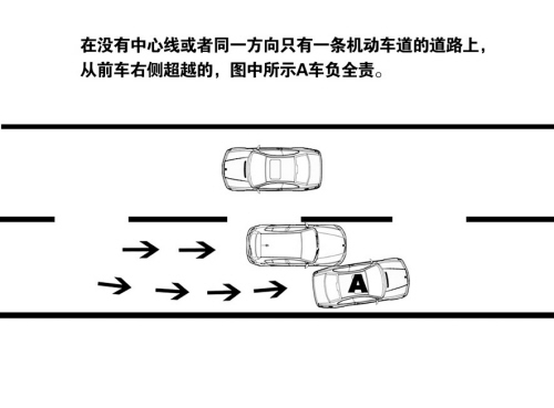 在没有中心线或者同一方向只有一条机动车道的道路上,从前车右侧超越的,图中所示A车负全责。