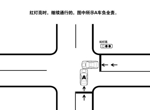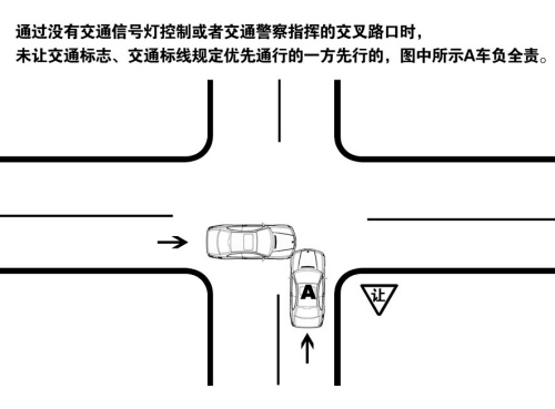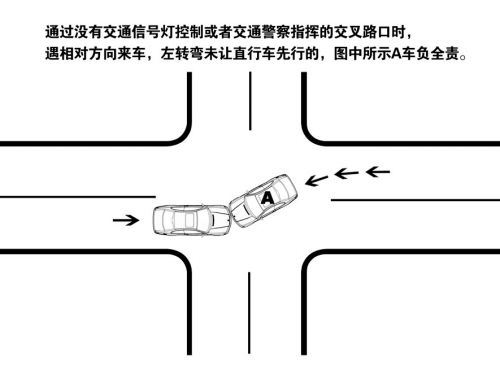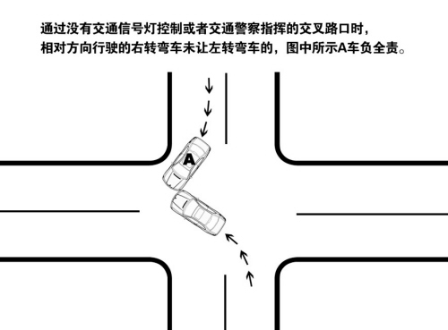 通过没有交通信号灯控制或者交通警察指挥的交叉路口时,相对方向行驶的右转弯车未让左转弯车的,图中所示A车负全责。