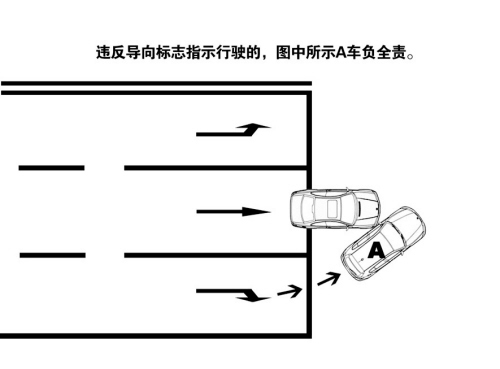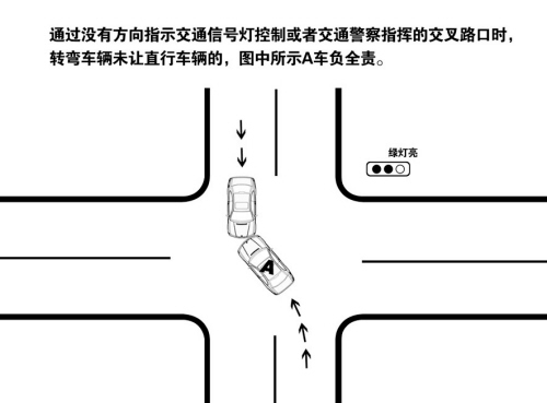 通过没有方向指示交通信号灯控制或者交通警察指挥的交叉路口时,转弯车辆未让直行车辆的,图中所示A车负全责。