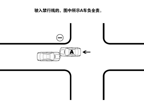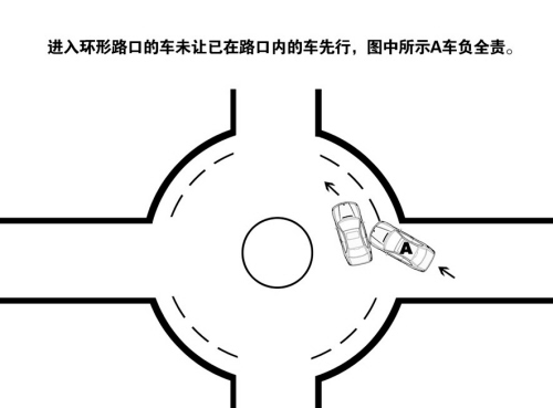 进入环形路口的车未让已在路口内的车先行,图中所示A车负全责。