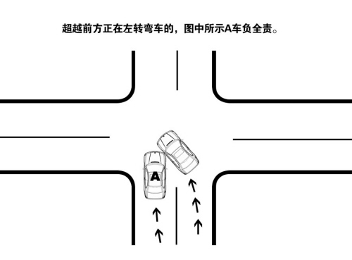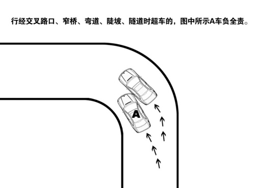 行经交叉路口、窄桥、弯道、陡坡、隧道时超车的,图中所示A车负全责。
