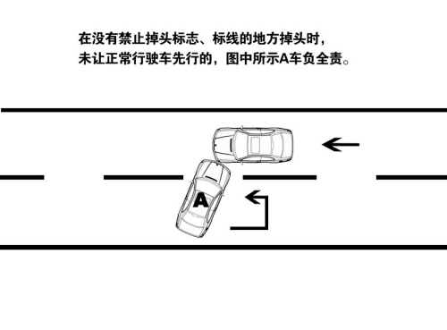在没有禁止掉头标志、标线的地方掉头时,未让正常行驶车先行的,图中所示A车负全责。