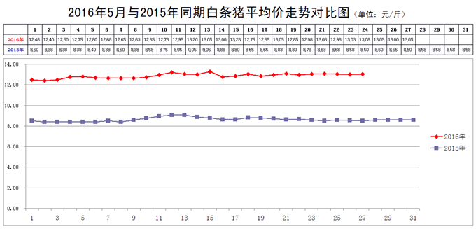 2016年5月27日,新发地市场白条猪的批发平均价是13.05元/斤,比2016年5月20日的12.98元/斤上涨0.54%;比2016年4月27日的12.50元/斤上涨4.40%;比2015年5月27日的8.50元/斤上涨53.53%。周环比微幅上涨;月环比明显上涨;年同比涨幅巨大。