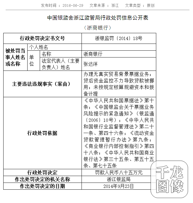 资料显示,浙商银行法定代表人(主要负责人)为张达洋,2014年9月23日,浙商银行存在办理无真实贸易背景票据业务;贷后资金监控不力导致贷款被挪用;未按规定核算规避资本和拨备计提等违规行为,按照《中华人民共和国票据法》第十条;《中国银监会关于票据业务风险提示的紧急通知》(银监通〔2006〕10号);《中华人民共和国银行业监督管理法》第二十一条、第四十六条;《流动资金贷款管理暂行办法》第九条;《商业银行内部控制指引》第四十八条;《中华人民共和国商业银行法》第三十五条、第五十五条、第七十五条,浙江银监局对其罚款人民币八十五万元。