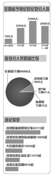 从处理人数上看,八项规定实施后至2013年末,全国共给予党纪政纪处分7692人;2014年处分23646人,增2倍;2015年处分33966人,较上一年增长44%。2016年1至8月处分26609人,已超过2014年全年总数。数据变化的背后体现了纪检监察机关加大查处力度,越往后执纪越严的要求。