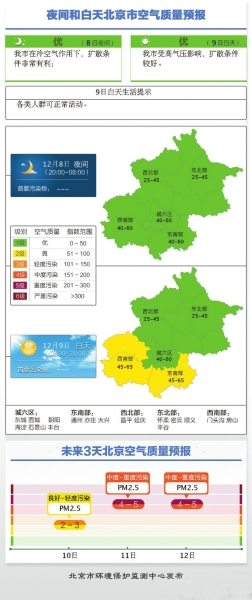 据北京市环环境保护监测中心预报,9日白天,北京受高气压影响,扩散条件较好,空气质量1级优;10日仍可维持良至轻度污染水平。11日、12日两日为中至重度污染水平。