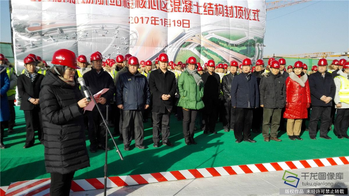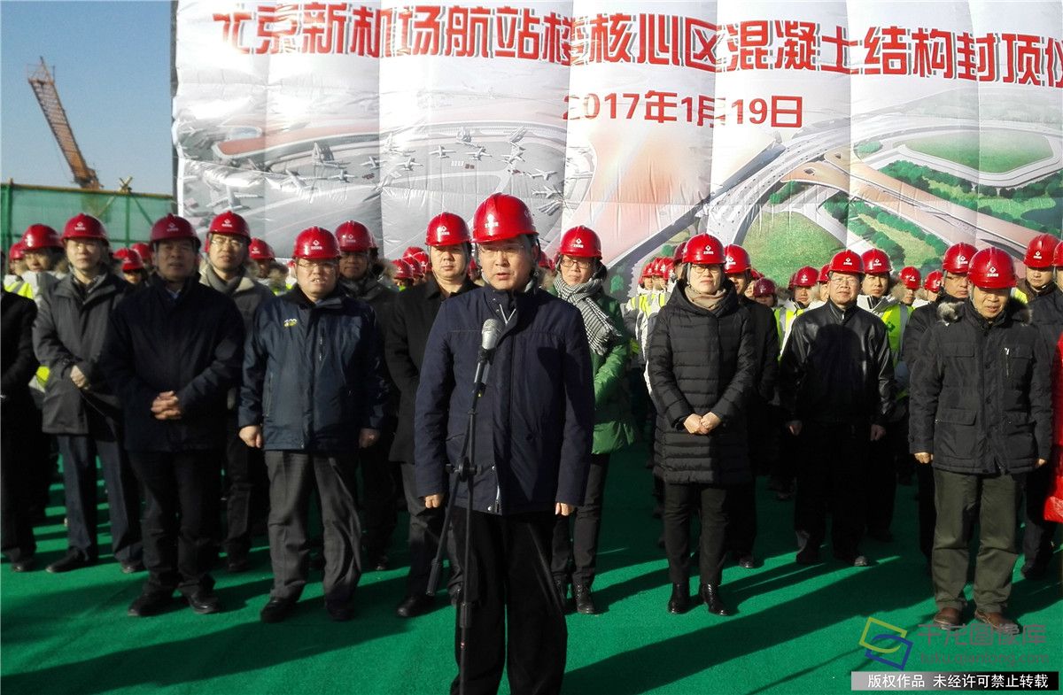 1月19日下午3点,一斗混凝土浇筑完成标志着由北京城建集团施工总承包的北京新机场主航站楼工程主体结构率先封顶。图为北京城建集团总经理郭延红致辞。