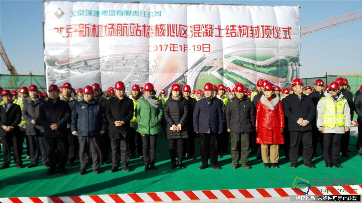 1月19日下午3点,由北京城建集团施工总承包的北京新机场主航站楼工程主体结构率先封顶,为下一步钢结构施工大面积展开打下了坚实的基础。图为北京城建集团公司党委书记、董事长陈代华,总经理郭延红等领导班子成员一起见证了主体结构封顶。