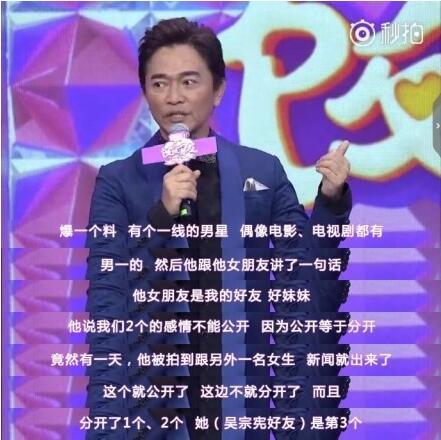 吴宗宪在节目中称,这位一线男明星对自己的女友说不能公开他们的恋情,因为公开等于分开,双方都是艺人,但没想到的是,有一天男星被曝拍到和另一名女生在一起,让男星女友没想到的是,分开了不止一个两个,吴宗宪的好友竟然是第三个。