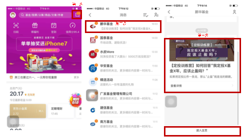 第一个“快捷键”就是“消息”功能键。点击京东金融APP右上角【消息】,就能看到你所关注的基金公司的动态更新列表,点开之后就能看到你所关心的基金公司的消息内容,如果还想看到该基金公司更多内容则可点击消息页下方的【进入主页】就直接跳转至该基金公司的店铺主页。