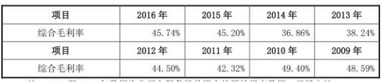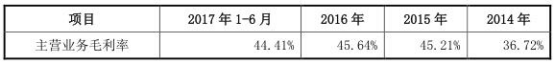 招股书显示,2013-2017年1-6月,公司主营业务毛利率38.09%、36.72%、45.21%、45.64%、44.41%。2009-2016年,公司综合毛利率48.59%、49.40%、42.32%、44.50%、38.24%、36.86%、45.20%、45.74%。2013-2016年,同行业公司毛利率平均值分别为32.15%、31.49%、26.91%、25.03%。