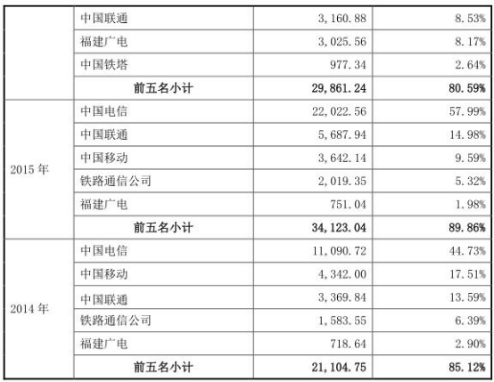 公司称,下游客户比较集中,公司经营业绩对三大通信运营商(中国电信、中国联通和中国移动)的依赖程度较高。2014-2017年1-6月,公司向前五名客户的销售收入金额分别为21,104.75万元、34,123.04万元、29,861.24万元、15,706.77万元,占营业收入的比例分别为85.12%、89.86%、80.59%、76.08%。