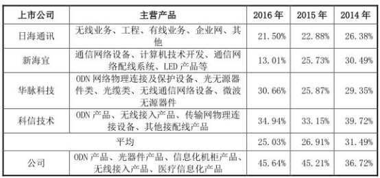 2015 年和 2016 年公司 ODN 产品毛利率高于科信技术 ODN 产品毛利,但和科信技术传输网物理连接设备毛利率相近;2015 年和 2016 年公司无线接入产品毛利率高于科信技术同类产品,2014 年公司光器件产品毛利率与华脉科技同类产品相近。