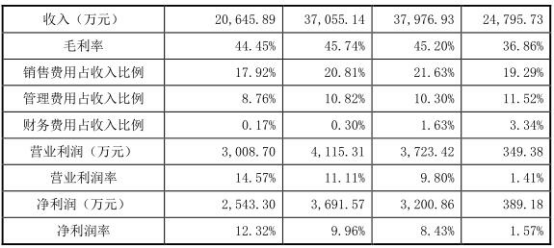 据招股书显示,2013-2017年1-6月,公司实现营业收入22,453.51万元、24,795.73万元、37,976.93万元、37,055.14万元、20,645.89万元。净利润分别为-230.14万元、389.18万元、3,200.86万元、3,691.57万元、2,543.30万元。经营活动产生的现金流量净额分别为-976.77万元、1,440.34万元、10,334.79万元、1,601.21万元、1,518.29万元。