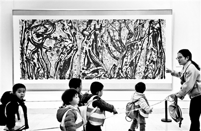 一名幼儿园老师带着小朋友们参观中国美术馆吴冠中的作品《根扎南国》 摄影/新华社记者 鲁鹏