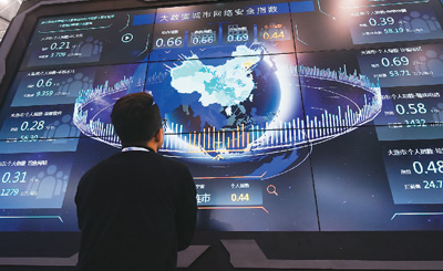 图为参观者在贵州贵阳观看“城市网络安全指数”的大数据展示屏。