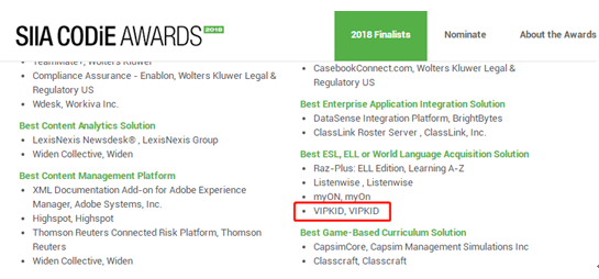 近日,美国软件与信息产业协会(SIIA)唯一核心大奖——科迪奖公布了最终入围企业名单,来自中国的在线英语教育品牌VIPKID成功入围“最佳语言习得解决方案”和“最佳课程内容编辑系统”两项大奖提名,成为从近万家参与企业中脱颖而出的唯一中国教育企业,这也标志着VIPKID的产品研发能力和创新能力,已经获得了国际权威教育机构的高度认可。