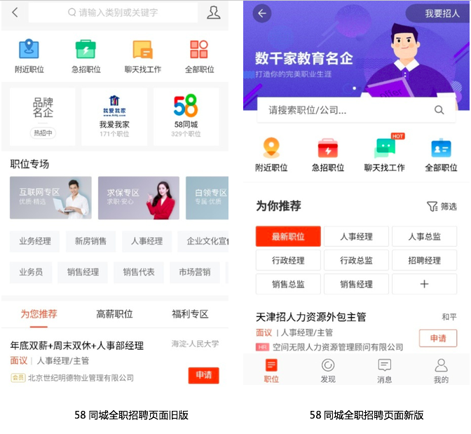 自今年7月,58同城全职招聘页面改版升级后,由于“发现”、“消息”、“我的”等用用户使用频繁的模块单设和前置,极大地缩短了用户使用路径,让更多用户依托58同城精准推荐和匹配求职需求,提高了求职招聘效率。