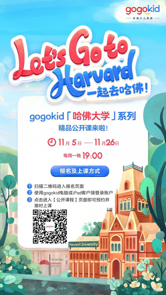 11月05日-26日期间每周一晚19:00,在线少儿英语gogokid推出「哈佛大学」系列精品公开课,课程分为“哈佛校史”“哈佛校友故事”“哈佛与中国”以及“哈佛一日游”四大主题,让孩子们全方位零距离体验美式文化的魅力。同时,作为唯一一家受邀教育机构,gogokid还将于11月19日参加美国哈佛大学学术研讨会。