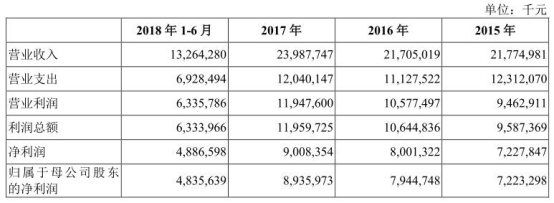2014年、2015年、2016年、2017年、2018年1-6月,重庆农商银行营业收入分别为197.10亿元、217.75亿元、217.05亿元、239.88亿元、132.64亿元;归属于母公司股东的净利润分别为68.28亿元、72.23亿元、79.45亿元、89.36亿元、48.36亿元。