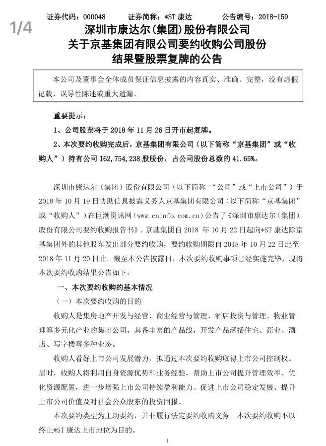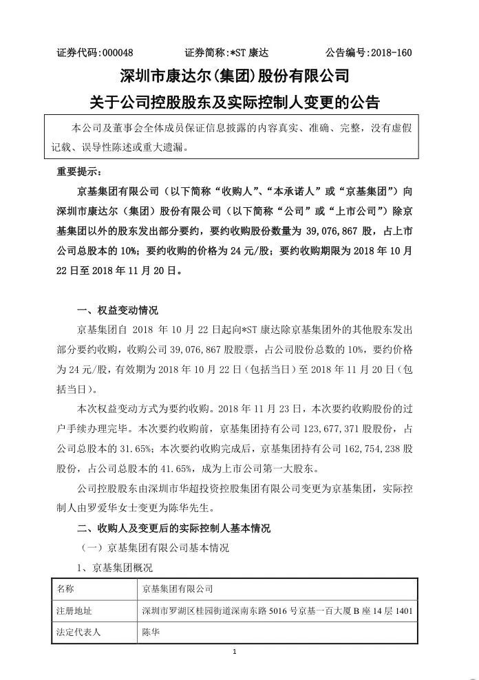 转折出现在2018年8月。8月3日晚公告,*ST康达称收到股东京基集团送达的要约收购报告书摘要,京基集团拟以部分要约方式收购公司除京基集团外的其他股东所持有的公司无限售条件的流通股即3908万股,占其股份总数的10%,要约价格为24元/股,较公司最新股价溢价近两成。