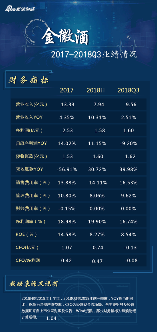 囿于地域性,即使上市时间恰好选在2015-2017年白酒行业复苏周期,金徽酒上市以来的财报表现仍极为惨淡,2014-2017年,公司分别实现净利润1.2亿、1.66亿、2.22亿、2.53亿,同比分别增长32.95%、33.81%和14.02%。2018年三季度,公司实现净利润1.6亿,同比下滑9.20%。