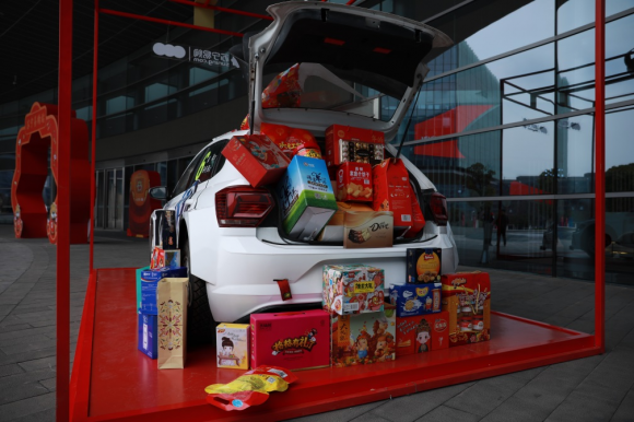 沈腾来之不易的座驾在苏宁年货节发布会,成了最佳的物流运输工具。坚果、饼干、巧克力、洋酒、面膜……传统年货与帅气赛车形成潮流混搭。