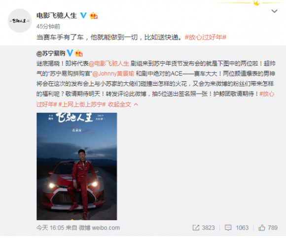 不惜千里送飞车,苏宁和《飞驰人生》的合作已然拉开帷幕。双方在娱乐营销上又会有何新的动作,值得期待。