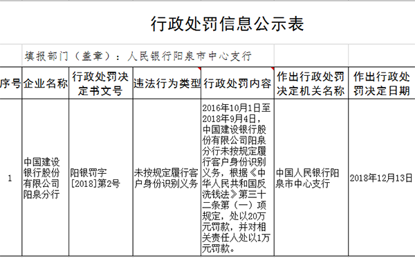 中国经济网北京1月9日讯 中国人民银行太原中心支行网站昨日公布的行政处罚信息公示表(阳银罚字[2018]第2号)显示,中国建设银行股份有限公司阳泉分行在2016年10月1日至2018年9月4日期间,未按规定履行客户身份识别义务,根据《中华人民共和国反洗钱法》第三十二条第(一)项规定,被中国人民银行阳泉市中心支行处以20万元罚款,并对相关责任人处以1万元罚款。