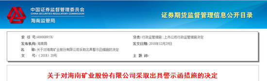 海南证监局表示,根据《上市公司信息披露管理办法》第五十九条,决定对海南矿业股份有限公司采取出具警示函的行政监管措施,并记入资本市场诚信信息数据库。