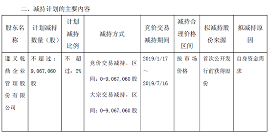 公司招股说明书显示,遵义乾鼎投资管理有限公司为公司职工持股公司,自2011年设立至今,据万得资讯企业库资料,遵义乾鼎投资管理有限公司没有明确的经营范围,公司本身作为持股主体,并不实体经营。可见,因资金需求的减持的理由并不充分,作为职工持股主体如此匆忙的减持股份,带给投资人的是更多的质疑。