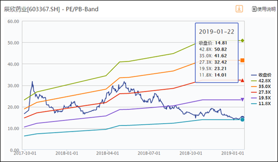由于公司目前还未出2018年年报,而九鼎的各个主体持股均为超过总股份的5%,因此其是否减持尚不清楚,而从公司的股价走势中或能看出端倪。公司目前的估值水平为上市以来的最低值,PE(TTM)为12.46。在Wind一级行业175家制药企业中,辰欣药业的估值排名倒数第12,里行业平均值25.28有较大差距,与科伦药业22倍市盈率的估值差距也不小。