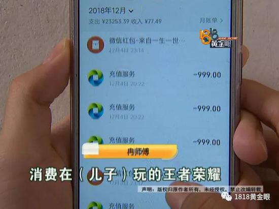 冉师傅说:“每一笔消费999元,一天三个999元,消费在儿子玩的王者荣耀,支付财付通里。”原来冉师傅有个10岁的儿子,经常用他妻子的手机玩游戏,他说这两万多是儿子在他不知情的情况下充值的。