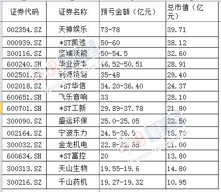 中国网财经记者注意到,在上述预告发生亏损的公司中,有14家亏损金额超过了公司总市值,分别为天神娱乐、*ST凯迪、坚瑞沃能、华业资本、利源精制、*ST华信、飞乐音响、*ST工新、盛运环保、宁波东力、金龙机电、*ST富控、天山生物、千山药机。